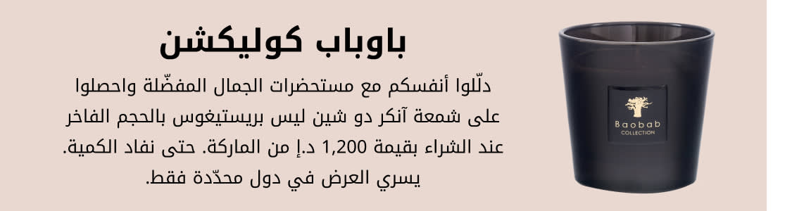 تأسست ماركة باوباب كوليكشن في بلجيكا عام 2002، لتحوّل العطور المنزلية إلى قطعة فنية فريدة. تصاميمها مستوحاة من المناظر الطبيعية الشاسعة في أفريقيا، حيث تدمج شموعها الكبيرة متعددة الفتائل والتحف الزخرفية بين الفرادة العطرية والتصاميم الفنية الخلابة. وبفضل النفحات الراقية التي تثير المشاعر والتصاميم المذهلة التي ترتقي بزوايا منزلك، تحتل باوباب كوليكشن مكانة رائدة في مجال العطور المنزلية الفاخرة، حيث تبتكر إبداعات آسرة بتفاصيل راقية ومميزة.